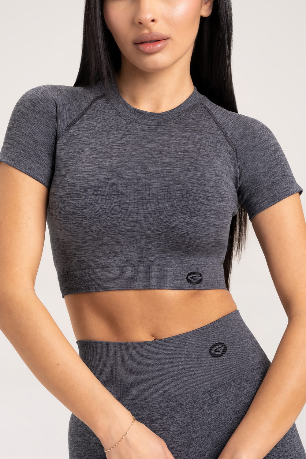 - Krótki, obcisły ciemnoszary top z krótkimi rękawami.